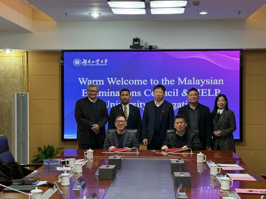 27 Januari 2026 (Selasa) - Ketua Eksekutif, Majlis Peperiksaan Malaysia (MPM) YBrs. Encik Badrul Hisham Bin Abdullah telah mengadakan mesyuarat dan perbincangan dengan Prof. Dr. Yin Xiaoyuan, Vice President of Hunan University of Technology (HUT), Prof. Dr. Zhang Dongmei, Director, Office of International Cooperation and Exchange HUT, dan Mr. Zhu Heping, Dean, School of Packaging Design and Art HUT dengan kerjasama Elite Empowerment Centre Sdn. Bhd. bagi tujuan mengelolakan Ujian Malaysian University English Test (MUET) dan Latihan MUET di wilayah Hunan, China.